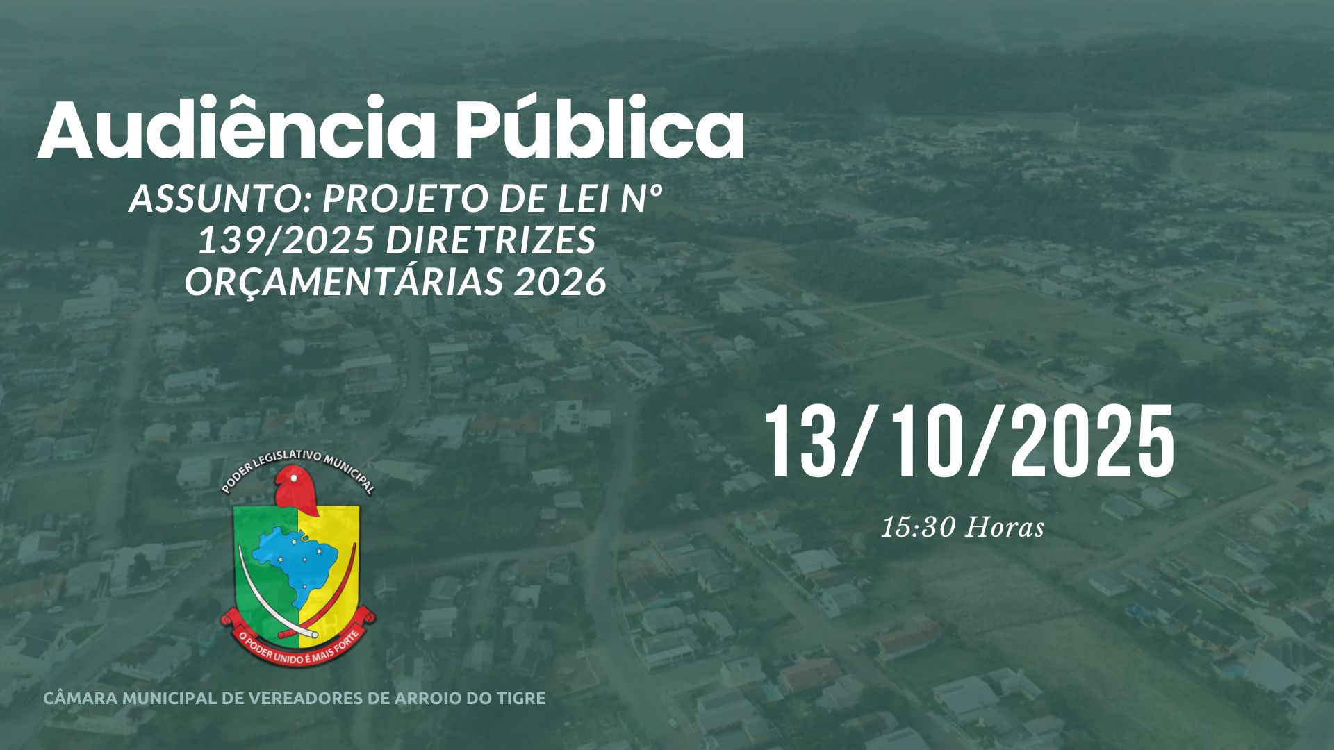 A Câmara Municipal de Arroio do Tigre, por meio da Comissão de Economia, Finanças e Orçamento, convida a comunidade para participar da Audiência Pública que será realizada na segunda-feira, 13 de outubro de 2025, às 15h30, no Plenário Armidório Oscar Pasa.