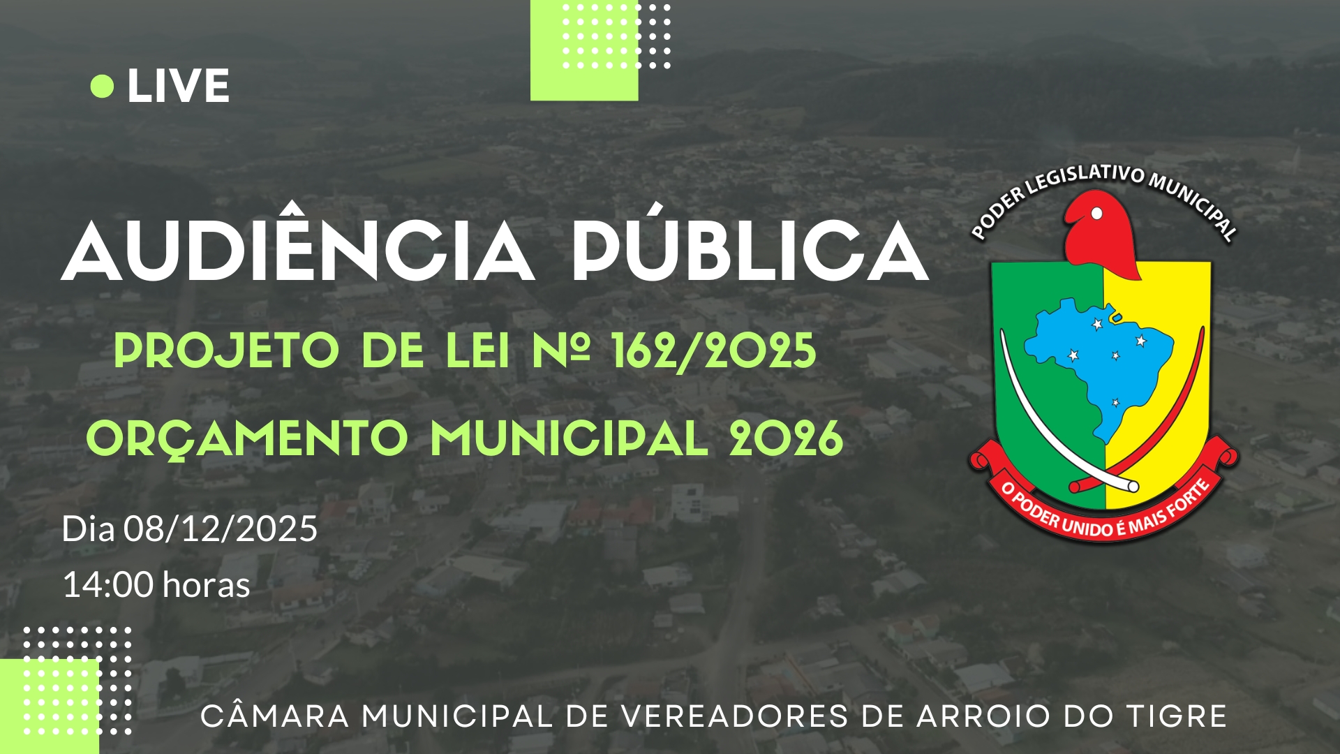 A Câmara Municipal de Vereadores de Arroio do Tigre realizará, no dia 08 de dezembro de 2025, às 14 horas, uma Audiência Pública para apresentação e discussão do Projeto de Lei nº 162/2025, que estima a receita e fixa a despesa do Município para o exercício financeiro de 2026 (Lei Orçamentária Anual – LOA).