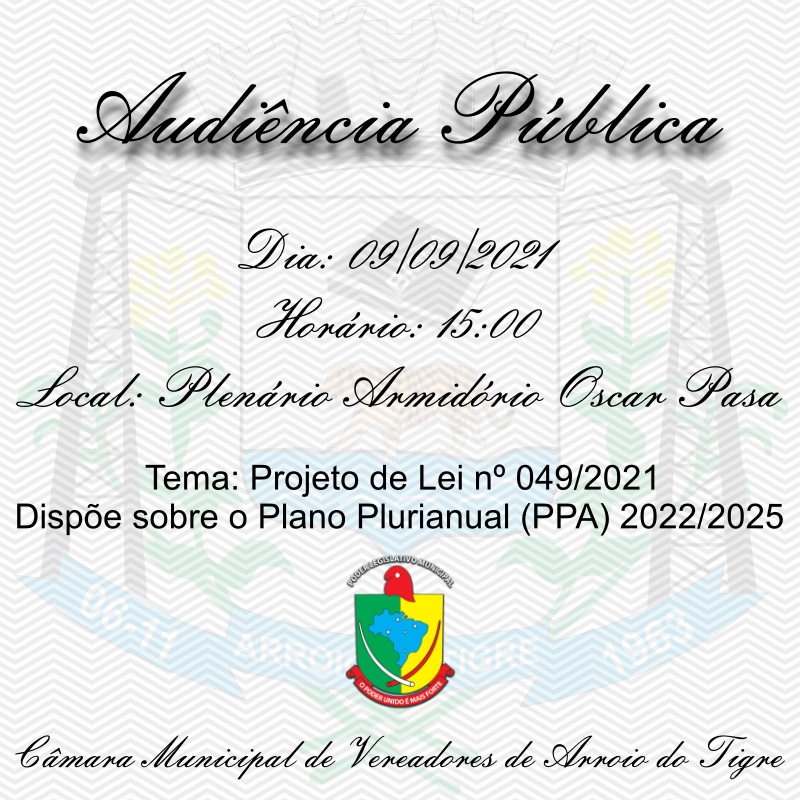 O Presidente da Comissão de Economia, Finanças e Orçamento, Vereador Auri Schneider convida a todos os munícipes para participarem de audiência pública com o intuito de debater o Projeto de Lei nº 049/2021 que dispõe sobre o plano plurianual (PPA) para o quadriênio 2022 a 2025.