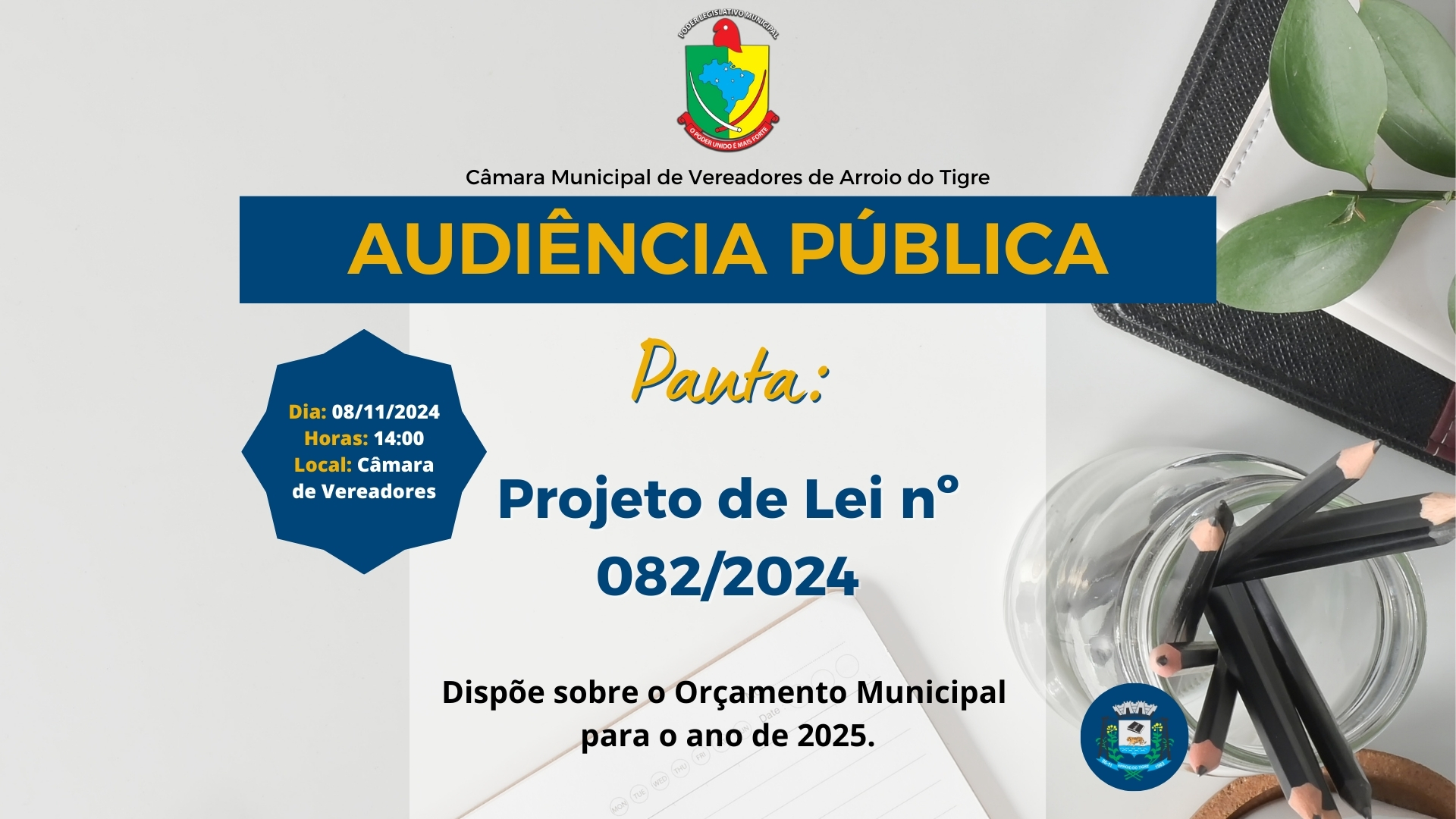 O objetivo desta audiência é debater o Projeto de Lei nº 082/2024, que estima a receita e fixa a despesa do Município de Arroio do Tigre para o exercício financeiro de 2025. Esta é uma oportunidade para que os munícipes conheçam e opinem sobre o orçamento do próximo ano, contribuindo ativamente para as decisões que impactam o futuro da nossa cidade.