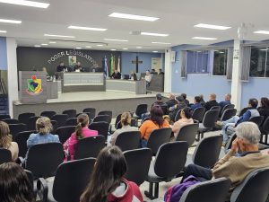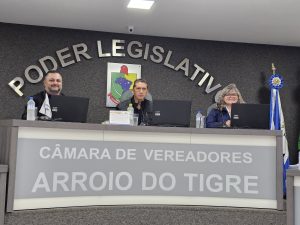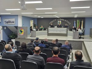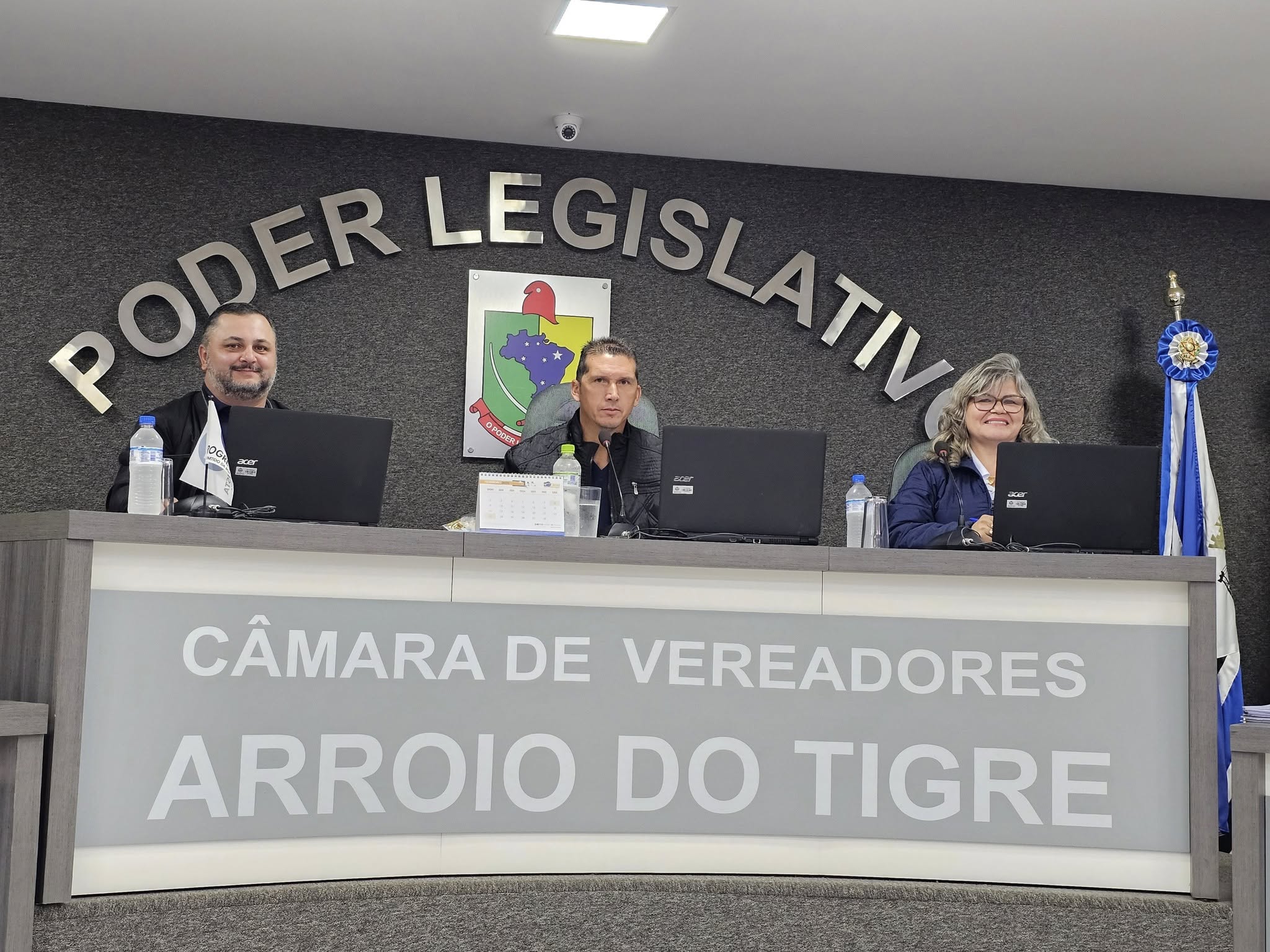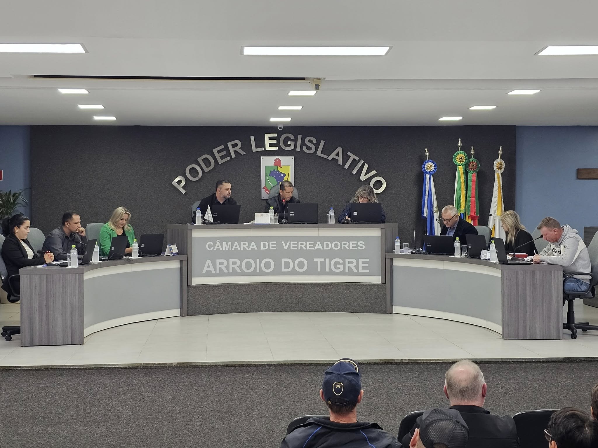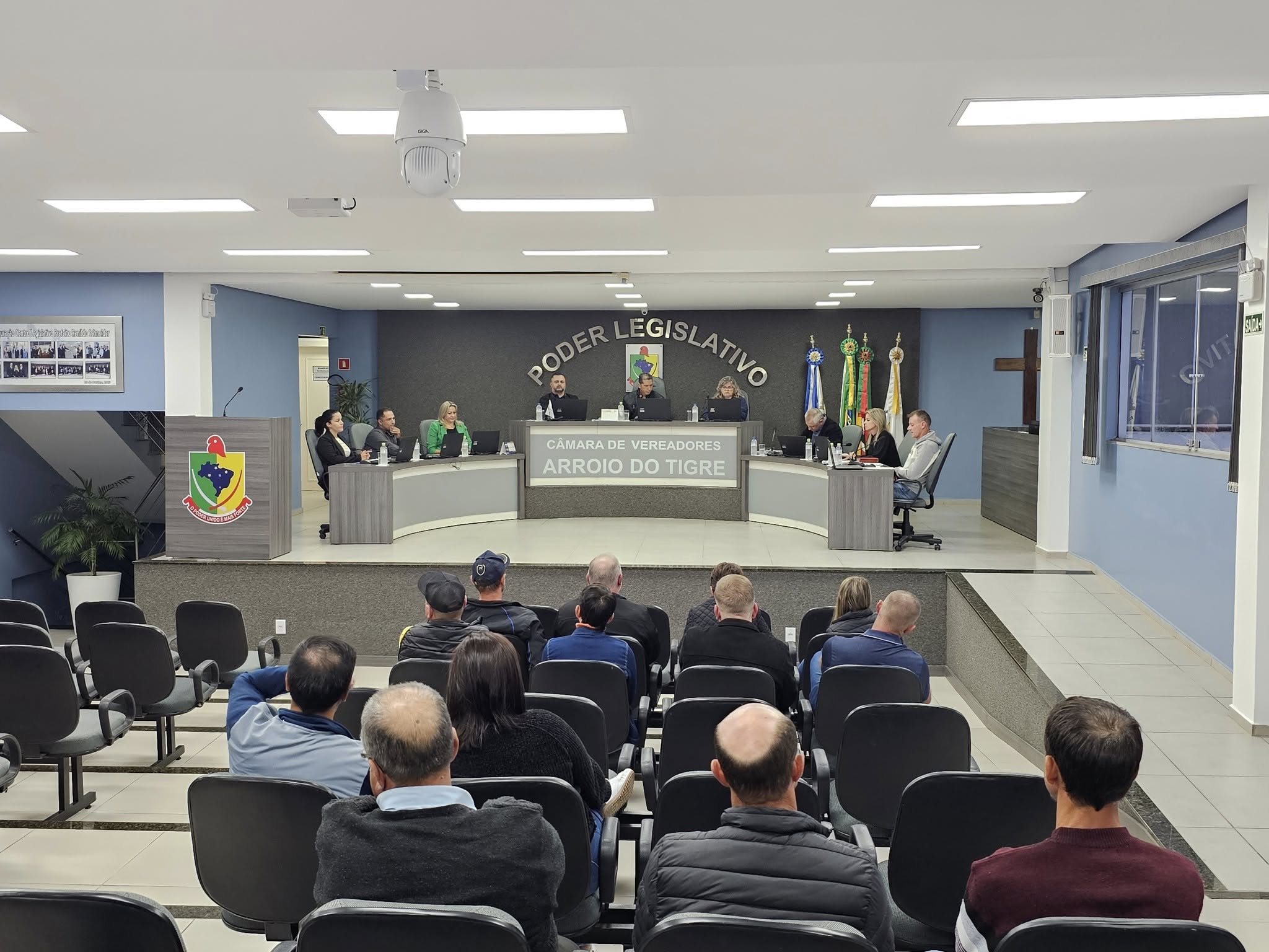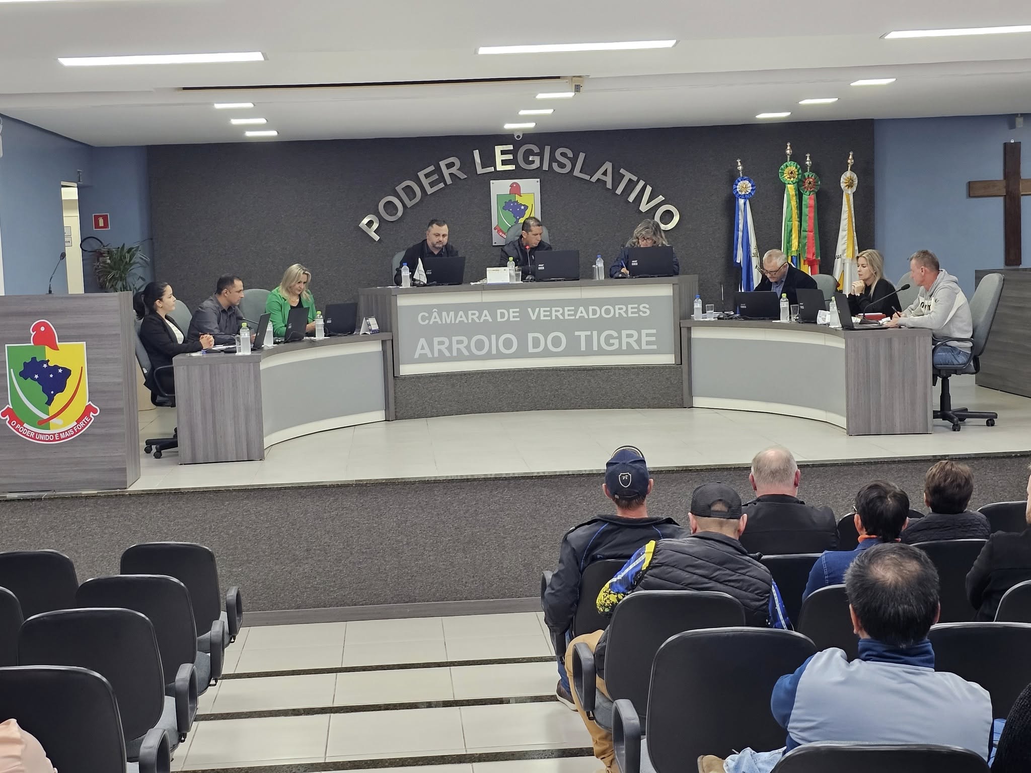 Com a presença de grande público, foi realizada, nesta segunda-feira, 7 de abril de 2025, a Sessão Ordinária nº 1658 da Câmara de Vereadores de Arroio do Tigre, no Plenário Armidório Oscar Pasa. Este foi o primeiro encontro do mês, durante o qual foram apreciados sete projetos abordando temas como fomento ao esporte, reorganização da estrutura administrativa, valorização dos servidores municipais, criação e reestruturação de cargos e ações de gestão rural e inclusão religiosa. Os trabalhos foram conduzidos pelo presidente da Câmara, Carlos Joceli da Silva (Carlinhos), PP.