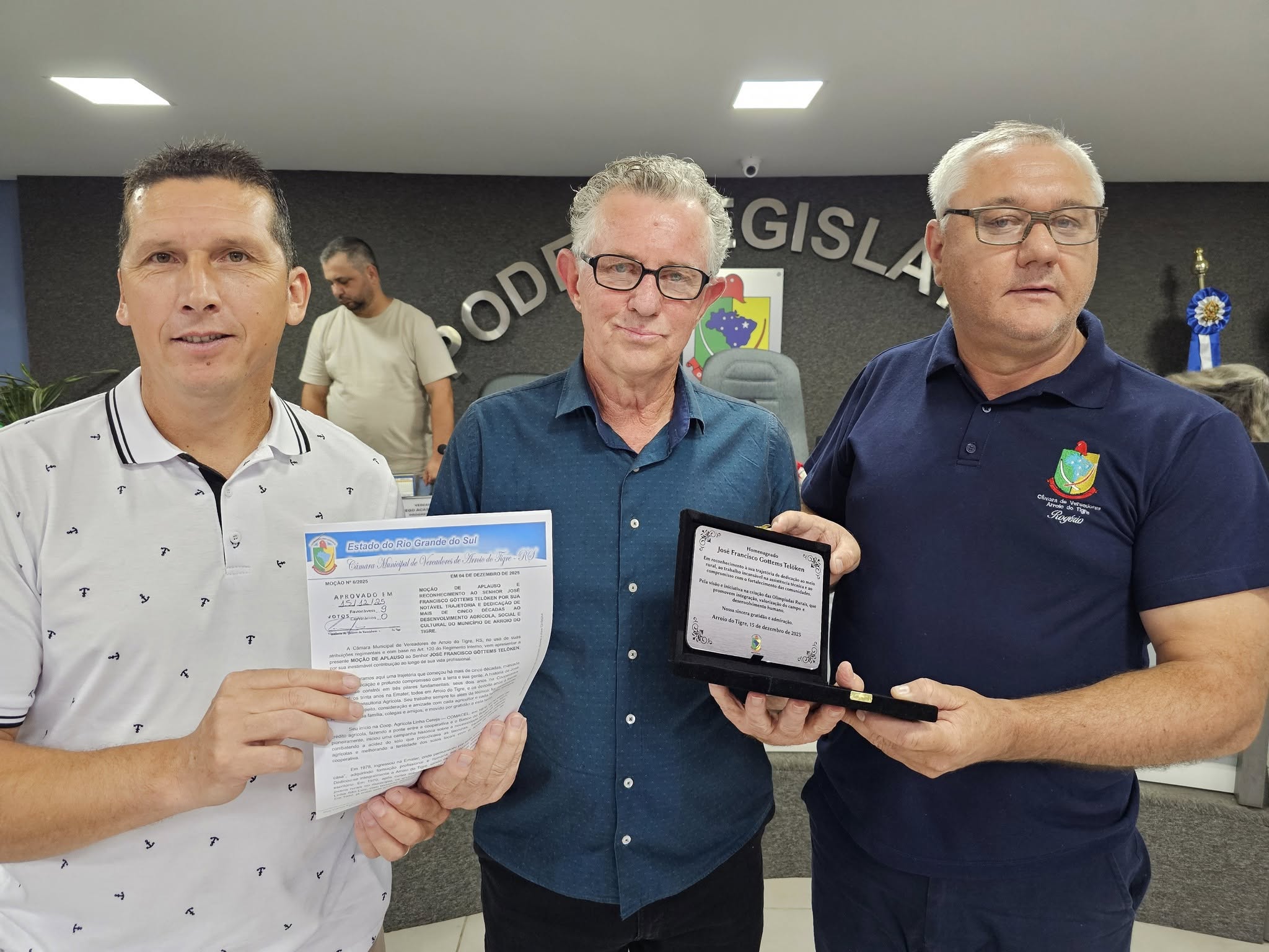A Sessão da Câmara de Vereadores de Arroio do Tigre, realizada na noite desta segunda-feira, 15 de dezembro, foi marcada por aplausos, emoção, lágrimas e reconhecimento. O técnico agrícola José Francisco Telöken recebeu uma Moção de Aplauso em homenagem aos seus 50 anos de trabalho dedicados à agricultura do município.